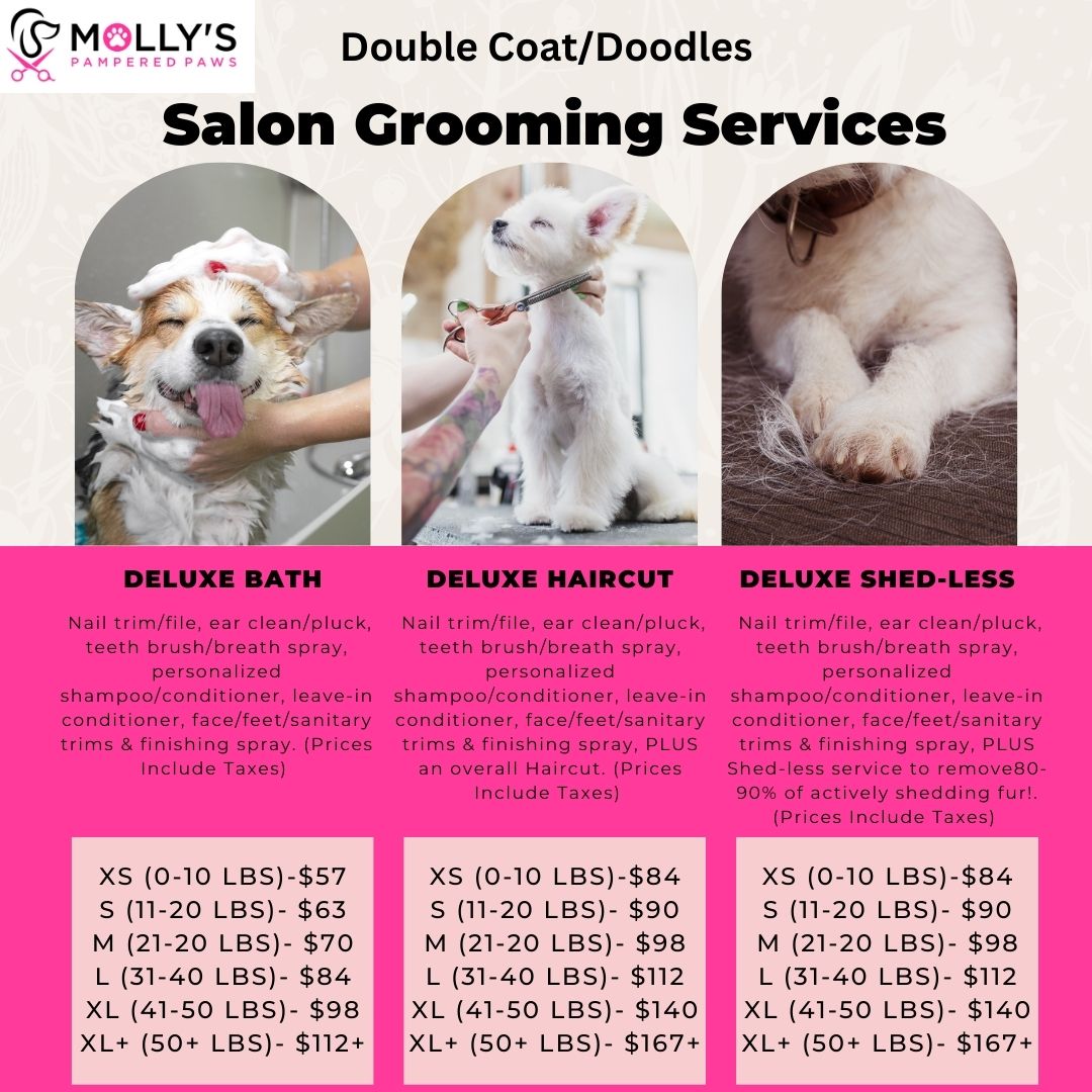 Our knowledgeable staff shares one priority: the very best treatment for the animals we work with. Molly’s Pampered Paws offers full-service bath, haircut, and shed-less packages to provide your furry family member with everything they need to stay happy, healthy, and looking good! Our skilled groomers use quality products, take part in continuing education, are pet CPR/First-Aid certified, and provide excellent customer service with pet parents! With our all-inclusive packaging, your pet will receive everything needed to stay happy, healthy, and looking great! All packages include (pet willing): nail trim & file, teeth brushing & breath spray, ear clean & pluck, double bath with personalized shampoo & conditioner, leave-in conditioner, face/feet/sanitary trims (if requested), and finishing spray! We also offer full-service pet & breed trims, as well as a shed-less package option for the super-shedders in your life! If you’re looking to add a pop of color we have you covered! Our color specialist can design a creation you & your pup are sure to love! We service all dog breeds & sizes for grooming, both with and without boarding reservations. Request one of our grooming stylists today! Call us today at 615-624-3914.