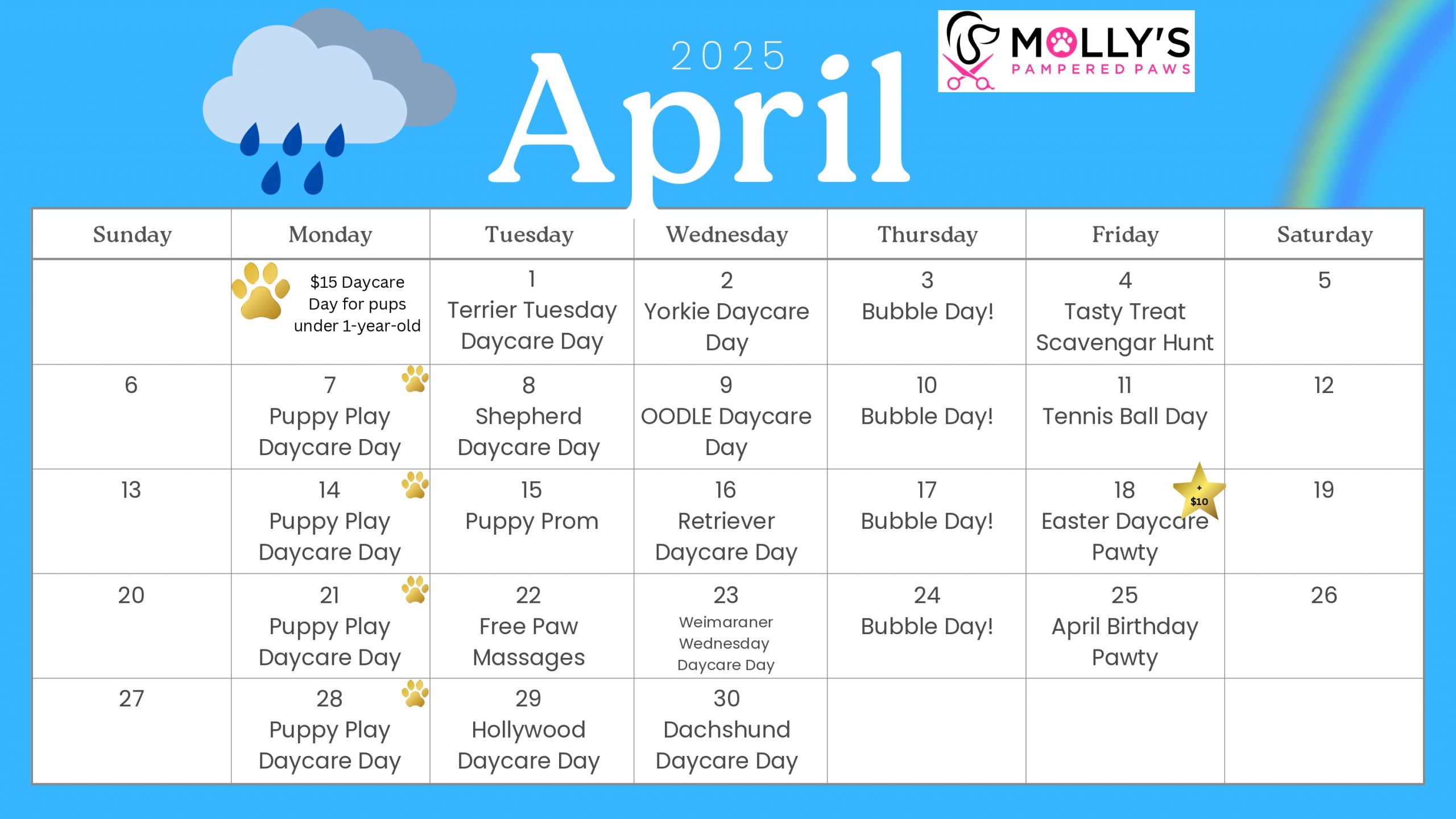 Molly’s Pampered Paws location offers a storybook setting for your canine family members! With large, private rooms, multiple outdoor & indoor play yards, nature walking trails, and enrichment package options to fit every pet’s needs, your pup will have a magical stay with us! We even have packages that allow for varying energy levels, age groups, photos to pet parents, wholesome treats, and more! Our team is multi-level certified, enrichment focused, and pet CPR/First-Aid trained to provide your furry family members with the best experience possible! We even have a full-service grooming salon on-site so your pup can go home smelling & looking great!